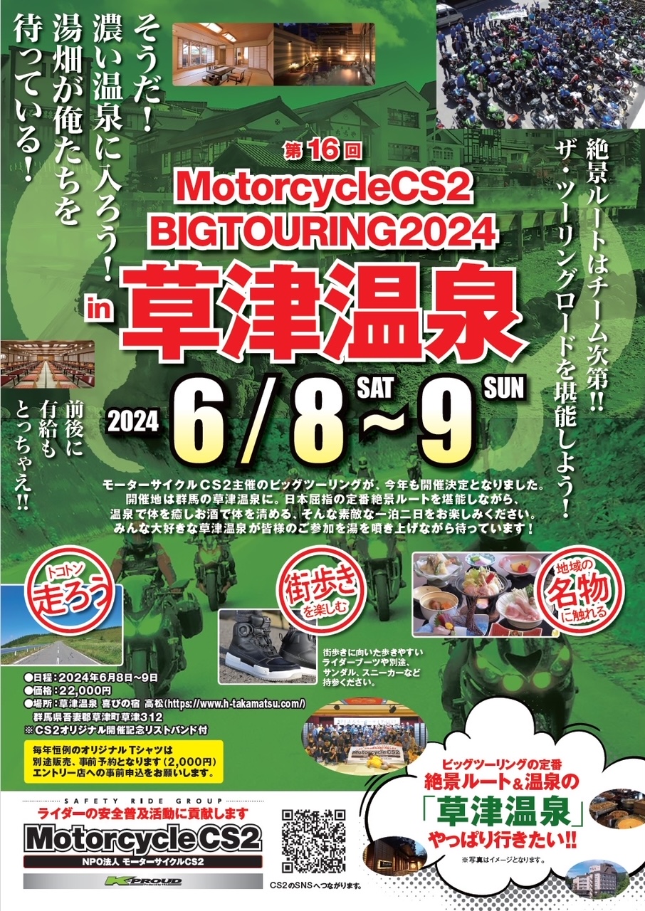 喜びの宿高松様 泊 | 【主催】モーターサイクル CS2 GROUP 【ツーリング報告はこちら】近場なので少々遠回りで面白いルートを設定します。午後は湯畑や温泉街を散策、温泉に浸かって夜は150人の大宴会!参加費22000円で記念Tシャツはオプションで2000円です |